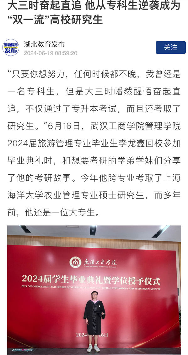 “只要你想努力,任何时候都不晚,我曾经是一名专科生,但是大三时幡然醒悟奋起直追,不仅通过了专升本考试,而且还考取了研究生。”6月16日,武汉工商学院管理学院2024届旅游管理专业毕业生李龙鑫回校参加毕业典礼时,和想要考研的学弟学妹们分享了他的考研故事。今年他跨专业考取了上海海洋大学农业管理专业硕士研究生,而多年前,他还是一位大专生。