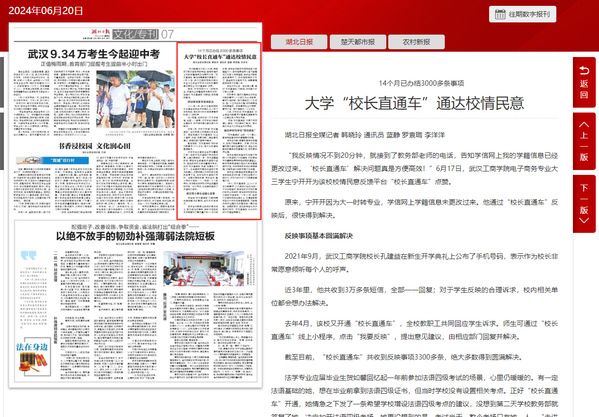 “我反映情况不到20分钟,就接到了教务部老师的电话,告知学信网上我的学籍信息已经更改过来。‘校长直通车’解决问题真是方便高效!”6月17日,武汉工商学院电子商务专业大三学生宁开开为该校校情民意反馈平台“校长直通车”点赞。