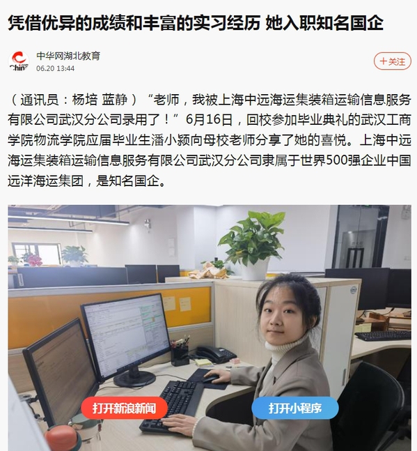 (通讯员:杨培 蓝静)“老师,我被上海中远海运集装箱运输信息服务有限公司武汉分公司录用了!”6月16日,回校参加毕业典礼的武汉工商学院物流学院应届毕业生潘小颍向母校老师分享了她的喜悦。上海中远海运集装箱运输信息服务有限公司武汉分公司隶属于世界500强企业中国远洋海运集团,是知名国企。