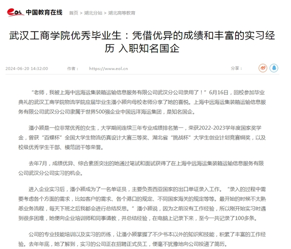 “老师,我被上海中远海运集装箱运输信息服务有限公司武汉分公司录用了!”6月16日,回校参加毕业典礼的武汉工商学院物流学院应届毕业生潘小颍向母校老师分享了她的喜悦。上海中远海运集装箱运输信息服务有限公司武汉分公司隶属于世界500强企业中国远洋海运集团,是知名国企。