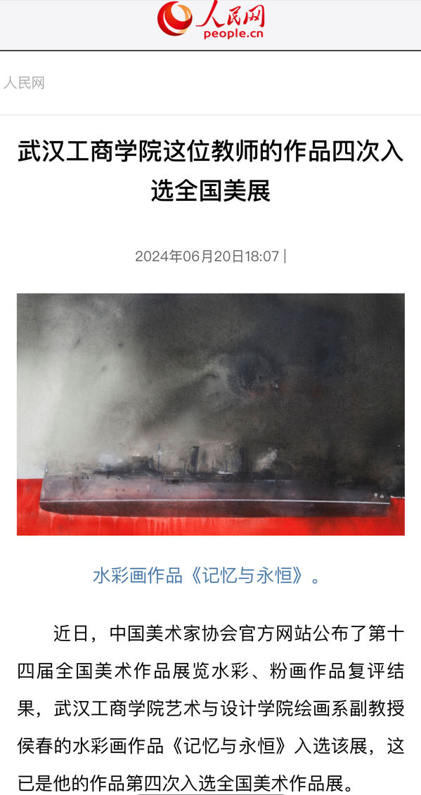近日,中国美术家协会官方网站公布了第十四届全国美术作品展览水彩、粉画作品复评结果,武汉工商学院艺术与设计学院绘画系副教授侯春的水彩画作品《记忆与永恒》入选该展,这已是他的作品第四次入选全国美术作品展。