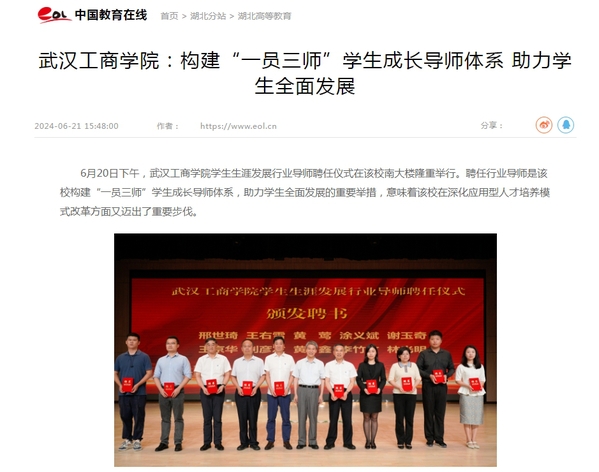 6月20日下午,武汉工商学院学生生涯发展行业导师聘任仪式在该校南大楼隆重举行。聘任行业导师是该校构建“一员三师”学生成长导师体系,助力学生全面发展的重要举措,意味着该校在深化应用型人才培养模式改革方面又迈出了重要步伐。