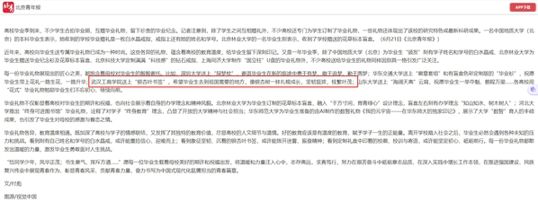 每一份毕业礼物展现出的匠心之美,都饱含着母校对毕业生的殷殷寄托。比如,深圳大学送上“探梦枕”,寄语毕业生在新的旅途中勇于有梦、敢于追梦、勤于圆梦;华东交通大学送上“徽章套组”和有盲盒色彩定制版的“毕业衫”,祝愿毕业生带上花礼一路生花、一路升华;武汉工商学院送上“银杏叶书签”,希望毕业生去到祖国需要的地方,像银杏树一样扎根成长,坚韧挺拔,枝繁叶茂;山东大学送上“海阔天高”云肩,祝愿毕业生一举夺魁、鹏程万里……各高校用“花式”毕业礼物勉励毕业生们不忘初心、继续向前。
