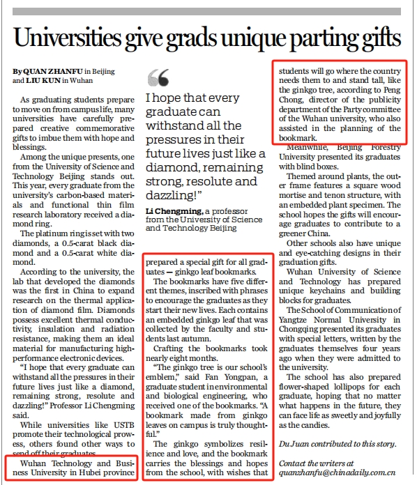 中国日报海外版:武汉工商学院给2024届毕业生送银杏叶书签毕业礼物