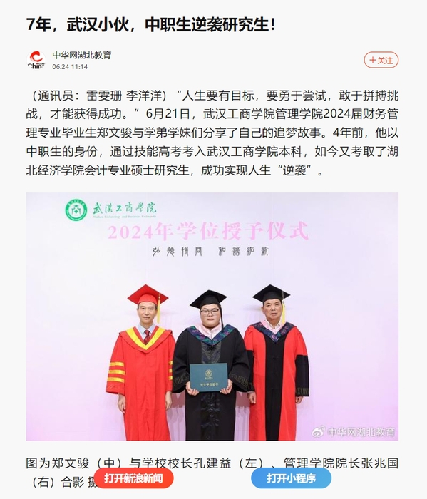 “人生要有目标,要勇于尝试,敢于拼搏挑战,才能获得成功。”6月21日,武汉工商学院管理学院2024届财务管理专业毕业生郑文骏与学弟学妹们分享了自己的追梦故事。4年前,他以中职生的身份,通过技能高考考入武汉工商学院本科,如今又考取了湖北经济学院会计专业硕士研究生,成功实现人生“逆袭”。