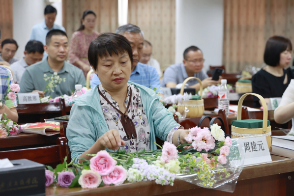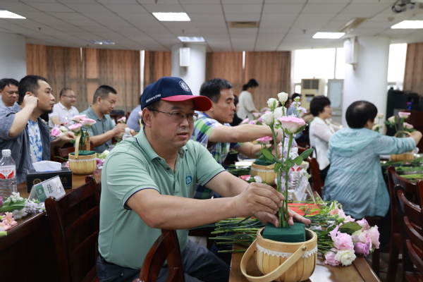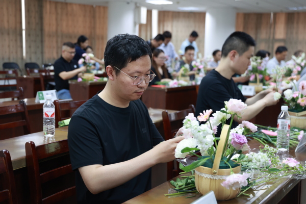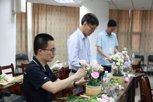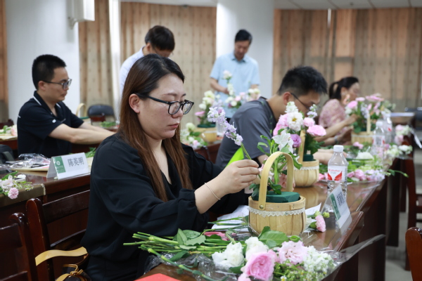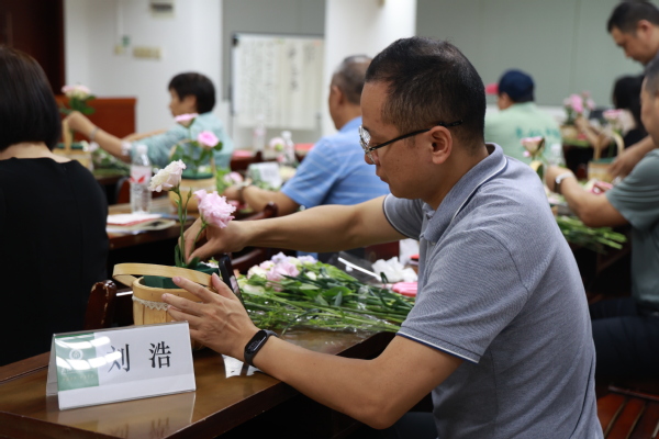 随后,与会人员一同体验了书法和花艺两个传统文化项目。左宗文副校长介绍了书法的起源和发展历程,并从书写的姿势、基本的起笔、行笔、收笔要领,以及字的形态结构等进行了细致讲解和生动展示,大家纷纷提笔,全神贯注地从横、竖、撇、捺、折等基础笔画开始,进行一笔一画的自主临摹练习,将学到的知识内化于心,外化于形。武汉市五境花园&5T.art食艺空间首席花艺师伍海军讲授了插花技巧,从花材、容器、色彩搭配等方面介绍了插花的造型要素和技巧手法,并现场带领大家进行插花实践体验。