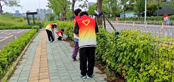 图为人工智能学院春生志愿服务队在青菱湖滨开展环境卫生清理活动