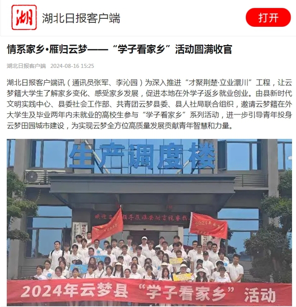 湖北日报客户端讯(通讯员张军、李沁园)为深入推进“才聚荆楚·立业澴川”工程,让云梦籍大学生了解家乡变化、感受家乡发展,促进本地在外学子返乡就业创业。由县新时代文明实践中心、县委社会工作部、共青团云梦县委、县人社局联合组织,邀请云梦籍在外大学生及毕业两年内未就业的高校生参与“学子看家乡”系列活动,进一步引导青年投身云梦田园城市建设,为实现云梦全方位高质量发展贡献青年智慧和力量。