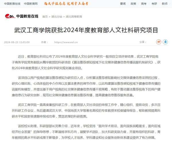近日,教育部社科司公布了2024年度教育部人文社会科学研究一般项目立项评审结果,武汉工商学院电子商务学院常务副院长魏华教授的科研项目《算法推荐感知视域下社交媒体健康信息传播说服机制研究》,获批2024年度教育部人文社会科学研究规划基金项目。
