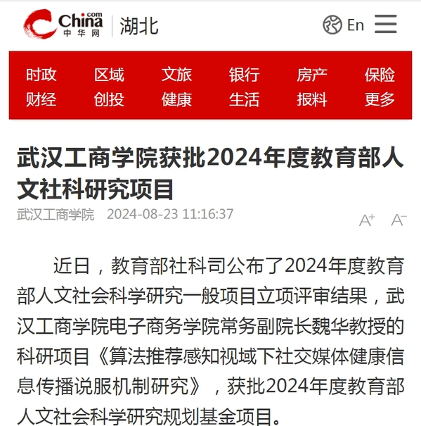 近日,教育部社科司公布了2024年度教育部人文社会科学研究一般项目立项评审结果,武汉工商学院电子商务学院常务副院长魏华教授的科研项目《算法推荐感知视域下社交媒体健康信息传播说服机制研究》,获批2024年度教育部人文社会科学研究规划基金项目。