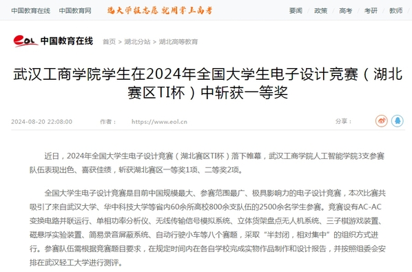 近日,2024年全国大学生电子设计竞赛(湖北赛区TI杯)落下帷幕,武汉工商学院人工智能学院3支参赛队伍表现出色、喜获佳绩,斩获湖北赛区一等奖1项、二等奖2项。