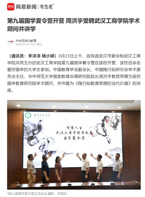 (通讯员:李洋洋 杨小婷)8月25日上午,由民进武汉市委会和武汉工商学院共同主办的武汉工商学院第九届国学夏令营在该校开营,该校百余名爱好国学的大学生参加。中国教育学会副会长、中国陶行知研究会学术委员会主任、华中师范大学国家教育治理研究院院长周洪宇教授受聘为该校国学教育研究院学术顾问,并作题为《陶行知教育思想的当代价值》的讲座。