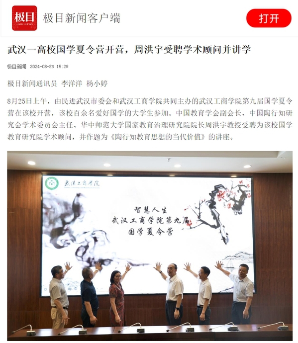 8月25日上午,由民进武汉市委会和武汉工商学院共同主办的武汉工商学院第九届国学夏令营在该校开营,该校百余名爱好国学的大学生参加。中国教育学会副会长、中国陶行知研究会学术委员会主任、华中师范大学国家教育治理研究院院长周洪宇教授受聘为该校国学教育研究院学术顾问,并作题为《陶行知教育思想的当代价值》的讲座。