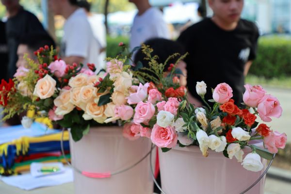 图为物流学院为新生赠花 摄影:芮雨欣
