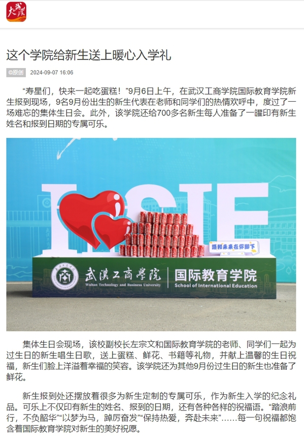 “寿星们,快来一起吃蛋糕!”9月6日上午,在武汉工商学院国际教育学院新生报到现场,9名9月份出生的新生代表在老师和同学们的热情欢呼中,度过了一场难忘的集体生日会。此外,该学院还给700多名新生每人准备了一罐印有新生姓名和报到日期的专属可乐。