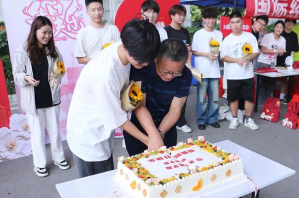 集体生日会现场,该校副校长左宗文和国际教育学院的老师、同学们一起为过生日的新生唱生日歌,送上蛋糕、鲜花、书籍等礼物,并献上温馨的生日祝福,新生们脸上洋溢着幸福的笑容。该学院还为其他9月份过生日的新生也准备了鲜花。