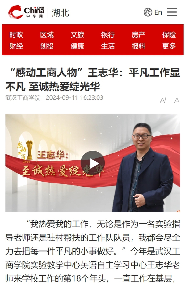 “我热爱我的工作,无论是作为一名实验指导老师还是驻村帮扶的工作队队员,我都会尽全力去把每一件平凡的小事做好。”今年是武汉工商学院实验教学中心英语自主学习中心王志华老师来学校工作的第18个年头,一直工作在基层,外表朴实无华的他,将满腔的热爱、无私的奉献投入到平凡的工作中,让平凡的工作也变得意义非凡。今年,他被学校评为第三届“感动工商人物”。