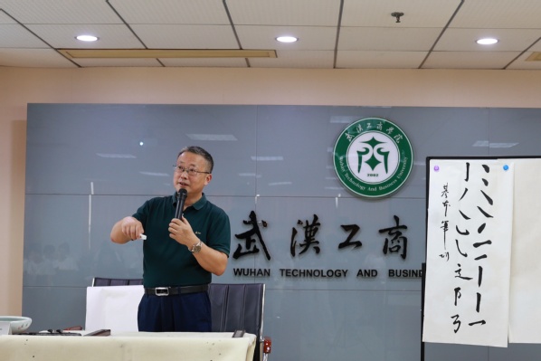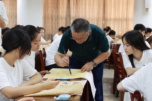图为左宗文副校长正在进行书法授课 摄影:贾馥羽