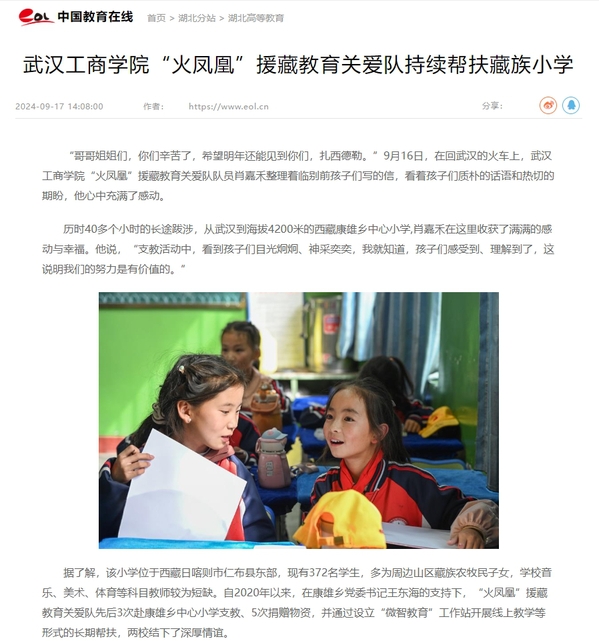 据了解,该小学位于西藏日喀则市仁布县东部,现有372名学生,多为周边山区藏族农牧民子女,学校音乐、美术、体育等科目教师较为短缺。自2020年以来,在康雄乡党委书记王东海的支持下,“火凤凰”援藏教育关爱队先后3次赴康雄乡中心小学支教、5次捐赠物资,并通过设立“微智教育”工作站开展线上教学等形式的长期帮扶,两校结下了深厚情谊。