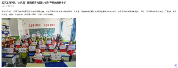今年9月6日,武汉工商学院管理学院辅导员陈金鑫、李长印带领5名学生志愿者组成“火凤凰”援藏教育关爱队来到西藏康雄乡中心小学,结合当地教学情况和需求,为四、五年级100多名学生上了航模、无人机体验、绘画、非遗漆扇、舞蹈等一系列“定制”的特色课程。
