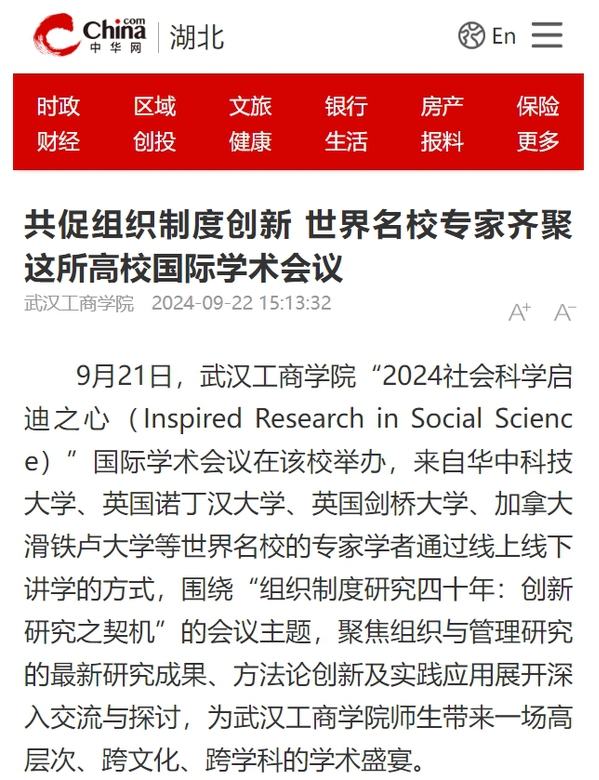 9月21日,武汉工商学院“2024社会科学启迪之心(Inspired Research in Social Science)”国际学术会议在该校举办,来自华中科技大学、英国诺丁汉大学、英国剑桥大学、加拿大滑铁卢大学等世界名校的专家学者通过线上线下讲学的方式,围绕“组织制度研究四十年:创新研究之契机”的会议主题,聚焦组织与管理研究的最新研究成果、方法论创新及实践应用展开深入交流与探讨,为武汉工商学院师生带来一场高层次、跨文化、跨学科的学术盛宴。