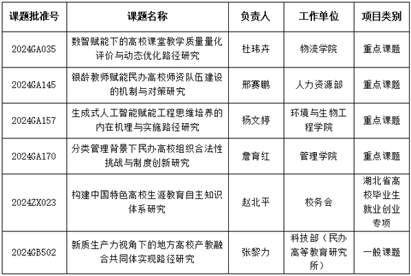 新闻中心讯(特约记者 张黎力)近日,湖北省教育厅公布了2024年度省教育科学规划课题评审的结果,武汉工商学院共有6项课题获批立项,其中重点课题4项,湖北省高校毕业生就业创业专项1项,一般课题1项,获批数量居全省同类高校前列,其中,重点课题获批数量再创学校历史新高,居全省同类高校首位。具体立项名单如下: