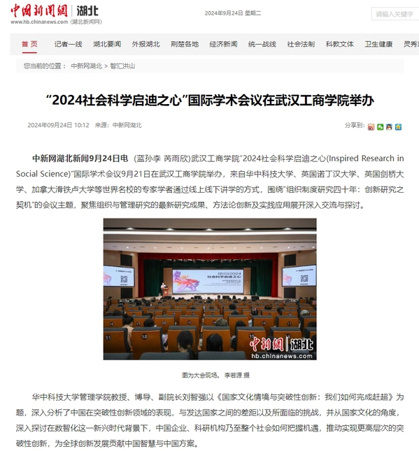 中新网湖北新闻9月24日电(蓝孙李 芮雨欣)武汉工商学院“2024社会科学启迪之心(Inspired Research in Social Science)”国际学术会议9月21日在武汉工商学院举办,来自华中科技大学、英国诺丁汉大学、英国剑桥大学、加拿大滑铁卢大学等世界名校的专家学者通过线上线下讲学的方式,围绕“组织制度研究四十年:创新研究之契机”的会议主题,聚焦组织与管理研究的最新研究成果、方法论创新及实践应用展开深入交流与探讨。