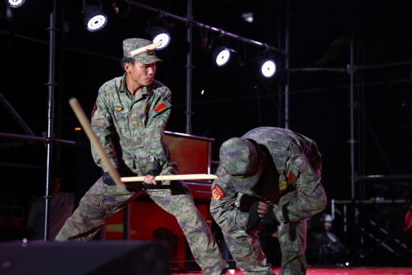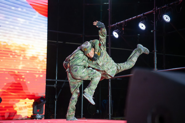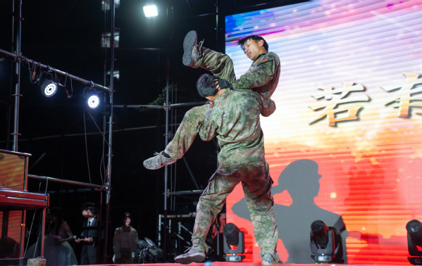 值得关注的是,2024级新生的6名军训教官代表也登台演出,以《战》为题,向师生们带来了一段气势恢宏的军事动作展示。推击弹踢、防上勾打、掏裆砍脖、抓腕砸肘、挡臂掏腿、马步侧打、踹腿锁喉,在响亮的口号声中,教官们斗志昂扬、步伐稳健,各项动作行云流水,以飒飒军姿展现出了坚韧不拔的意志和不屈不挠的精神风貌,将现场气氛推向高潮。