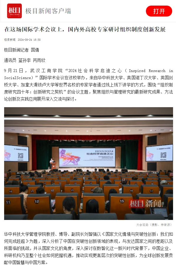 9月21日,武汉工商学院“2024社会科学启迪之心(Inspired Research in SocialScience)”国际学术会议在该校举办,来自华中科技大学、英国诺丁汉大学、英国剑桥大学、加拿大滑铁卢大学等世界名校的专家学者通过线上线下讲学的方式,围绕“组织制度研究四十年:创新研究之契机”的会议主题,聚焦组织与管理研究的最新研究成果、方法论创新及实践应用展开深入交流与探讨。