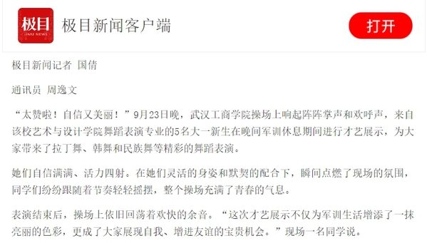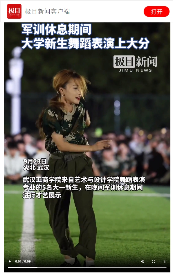 “太赞啦!自信又美丽!”9月23日晚,武汉工商学院操场上响起阵阵掌声和欢呼声,来自该校艺术与设计学院舞蹈表演专业的5名大一新生在晚间军训休息期间进行才艺展示,为大家带来了拉丁舞、韩舞和民族舞等精彩的舞蹈表演。