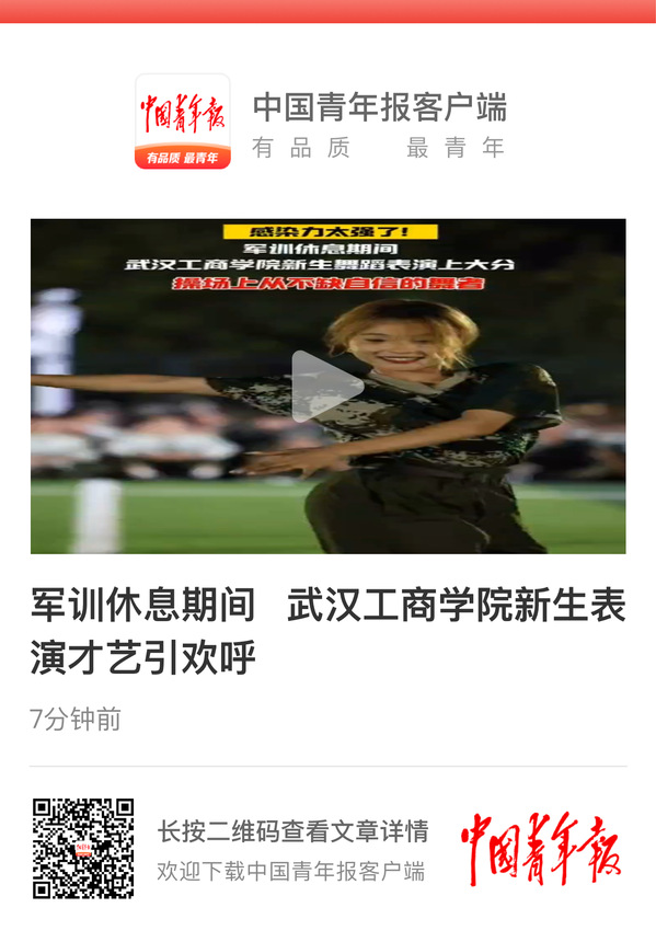 “太赞啦!自信又美丽!”9月23日晚,武汉工商学院操场上响起阵阵掌声和欢呼声,来自学校艺术与设计学院舞蹈表演专业的5名大一新生在晚间军训休息期间进行才艺展示,为大家带来了拉丁舞、韩舞和民族舞3段精彩的舞蹈表演。她们自信满满、活力四射,引全场欢呼!
