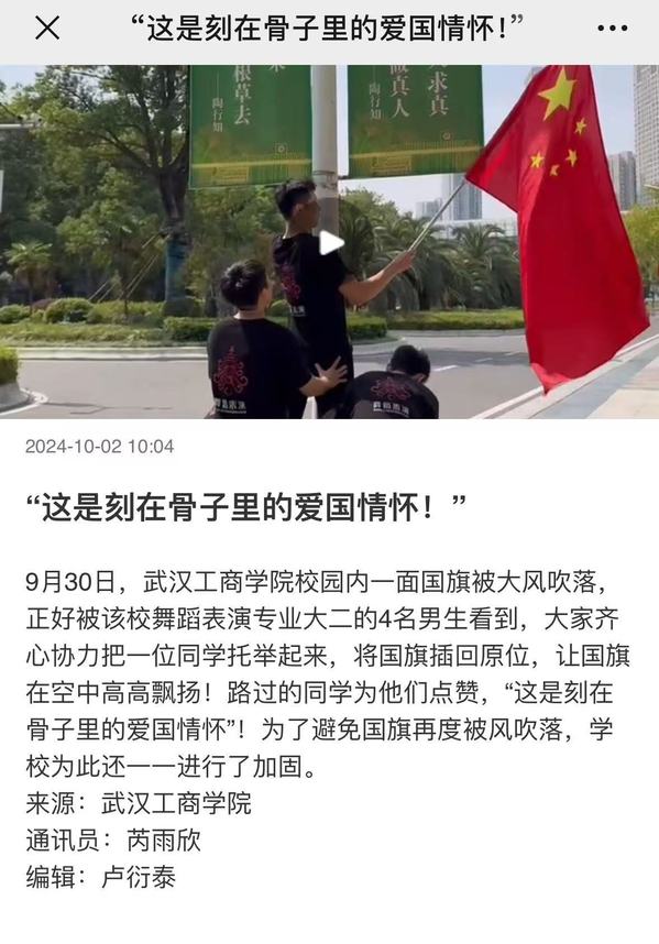 9月30日,武汉工商学院校园内一面国旗被大风吹落,正好被该校舞蹈表演专业大二的4名男生看到,大家齐心协力把一位同学托举起来,将国旗插回原位,让国旗在空中高高飘扬!路过的同学为他们点赞,“这是刻在骨子里的爱国情怀”!为了避免国旗再度被风吹落,学校为此还一一进行了加固。