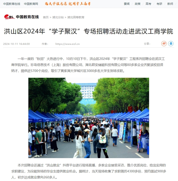 一年一度的“秋招”火热进行中,10月10日下午,洪山区2024年“学子聚汉”工程系列招聘会在武汉工商学院举行。珍岛信息技术(上海)股份有限公司、湖北君安储能科技有限公司等80多家企业齐聚该校招贤纳才,提供近5700个岗位,吸引了黄家湖大学城片区3000多名大学生到场求职。