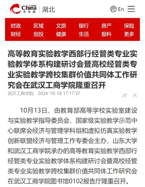 10月13日,由教育部高等学校实验室建设与实验教学指导委员会、国家级实验教学示范中心联席会经济与管理学科组和虚拟仿真实验教学创新联盟经济与管理工作专委会主办,山东大学和武汉工商学院承办的高等教育实验教学西部行经管类专业实验教学体系构建研讨会暨高校经管类专业实验教学跨校集群价值共同体工作研究会在武汉工商学院图书馆0102报告厅隆重召开。