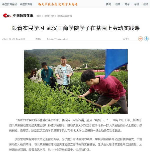 该校管理学院党总支书记王留志介绍,为了提升劳动教育的效果,学院积极创新劳动教育教学模式,丰富劳动育人教育阵地,与九畹溪镇石柱村圣天庄园建立劳动教育实践基地,让学生从理论课堂走向实践课堂,从校园走进茶园,跟着农民学习,从中体会劳动的艰辛、快乐和价值。