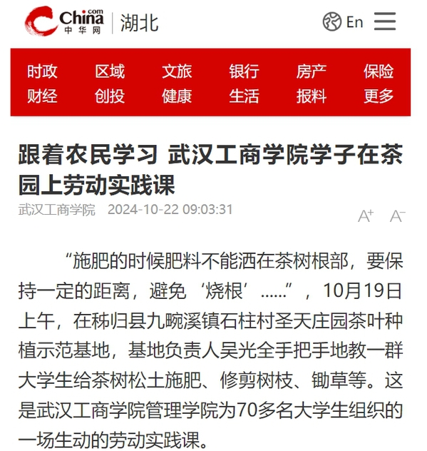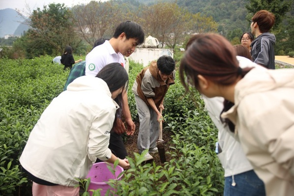 “施肥的时候肥料不能洒在茶树根部,要保持一定的距离,避免‘烧根’......”,10月19日上午,在秭归县九畹溪镇石柱村圣天庄园茶叶种植示范基地,基地负责人吴光全手把手地教一群大学生给茶树松土施肥、修剪树枝、锄草等。这是武汉工商学院管理学院为70多名大学生组织的一场生动的劳动实践课。