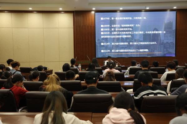 为了印证这些观点,谌达军列举了诸多荣获中国新闻奖的优秀作品案例:《中共中央党史研究室主任披露7常委参观〈复兴之路〉出行不封路》的作者以高度的政治敏锐性捕捉新闻,迅速、鲜明地传递出新一届中央领导集体的政治新气象;《长江上游仍在砍树》的作者以高度的社会责任感和使命感,通过揭示环境问题,引发了社会对可持续发展的关注;《武汉上空的鹰·寻访苏联空军志愿队烈士》的作者关注历史,坚持不懈寻开展跨国采访,寻访中苏两国空军战士并肩御敌、鹰击长空的历史;《大山里的百灵鸟——冬奥开幕式上唱着奥运会歌的山里孩子》则通过讲述山区孩子用歌声传递奥运精神的故事,展现了中国脱贫攻坚和乡村振兴的成就,引发了社会公众的共鸣......此外,他还列举了一些省内高校的优秀新闻作品,向同学们讲述这些新闻背后的故事。