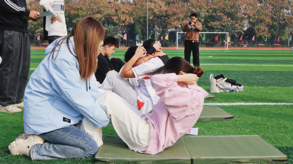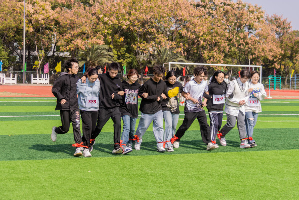 学生组集体项目比赛也吸引了不少人的围观,其中多人多足项目格外考验团体合作的默契,只见同学们手挽着手或搭着肩,喊着口号,踏着整齐的步伐,齐头并进、快而不乱。尽管有些班级在刚开始的时候没有找到统一的步调,导致中途摔倒,但他们都努力快速调整,争取发挥出自己最好的水平。观赛同学的加油呐喊声更是让队员激情高涨,斗志昂扬,展现了武工商学子的活力四射和团结友爱。