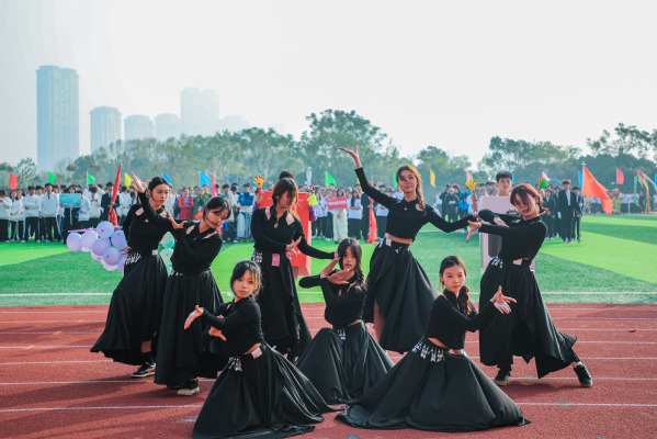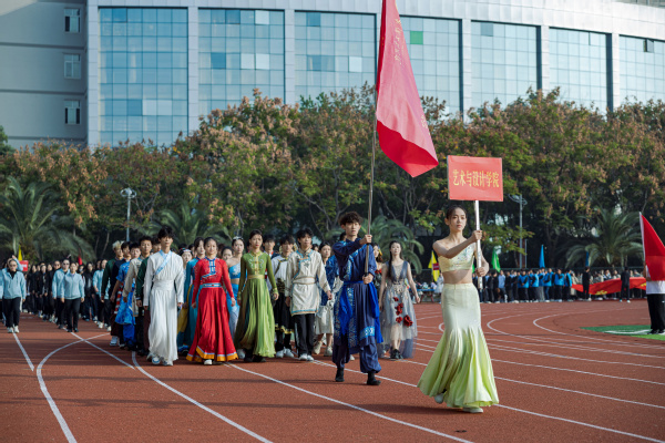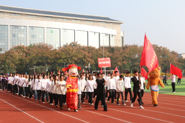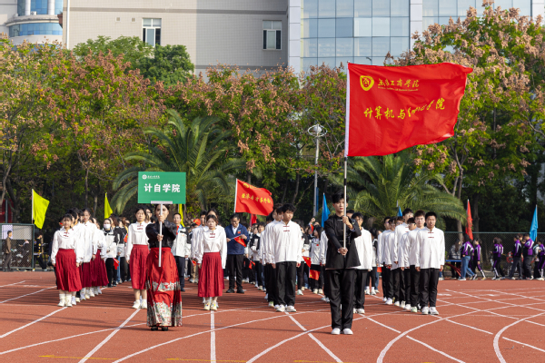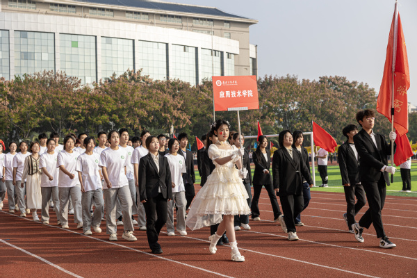 伴随着雄壮激昂的《运动员进行曲》,国旗队以及来自各二级学院的师生代表队昂首挺胸、英姿飒爽,迈着铿锵有力的步伐依次入场,大家各出奇招,通过服装走秀、啦啦操、现代舞、双人舞等各具特色的表演,展现出师生奋发昂扬、活力四射的精神风貌和青春风采,赢得现场阵阵掌声。