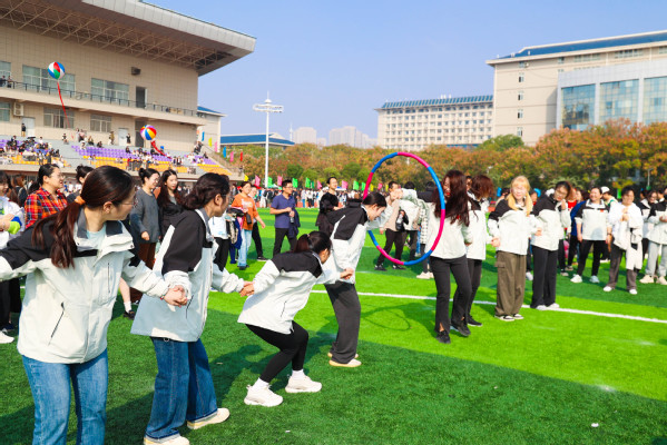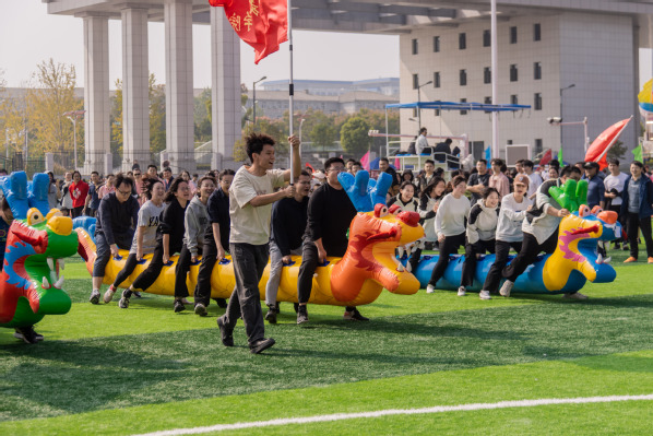 在教职工“一圈到底”项目比赛中,只见老师们11人一组,手牵着手,通过整齐划一的“一二一”活动身体,以最快的速度将呼啦圈穿过自己的身体并传递给队友,吸引了不少学生在一旁摇旗呐喊、加油助威。在“旱地龙舟”的比赛中,只见老师们8人一组跨坐在龙舟上,齐心协力一同抬起龙舟,以双脚为桨,步调整齐地冲向终点……现场气氛紧张激烈,充满了欢声笑语,老师们一致表示既锻炼了身体,还收获了快乐、放松了心情,大家纷纷在赛后合影留念,共同记录这一美好时刻。