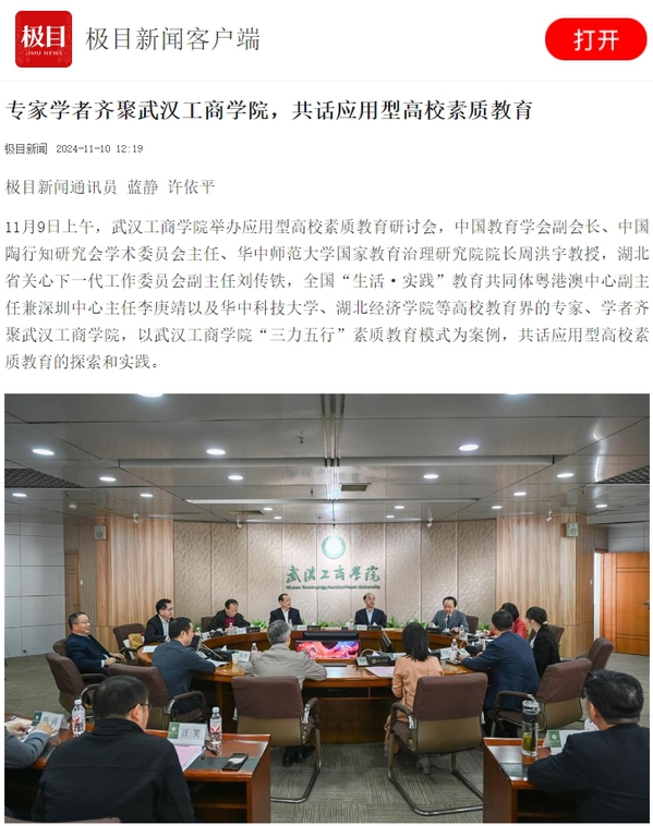 11月9日上午,武汉工商学院举办应用型高校素质教育研讨会,中国教育学会副会长、中国陶行知研究会学术委员会主任、华中师范大学国家教育治理研究院院长周洪宇教授,湖北省关心下一代工作委员会副主任刘传铁,全国“生活·实践”教育共同体粤港澳中心副主任兼深圳中心主任李庚靖以及华中科技大学、湖北经济学院等高校教育界的专家、学者齐聚武汉工商学院,以武汉工商学院“三力五行”素质教育模式为案例,共话应用型高校素质教育的探索和实践。