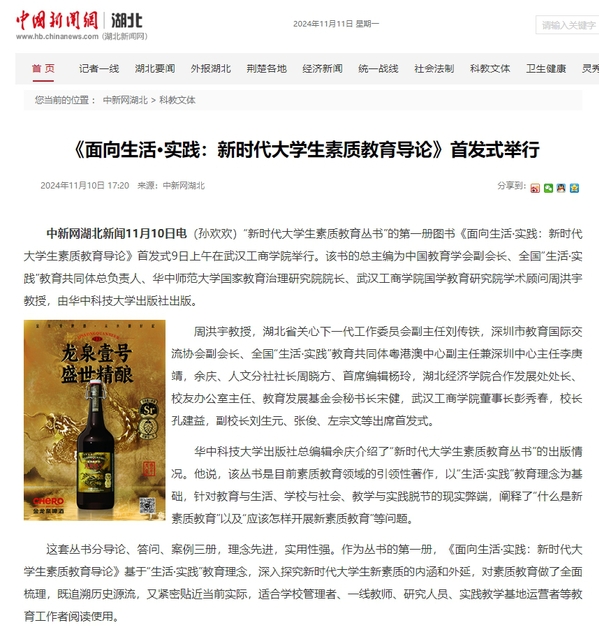 中新网湖北新闻11月10日电(孙欢欢)“新时代大学生素质教育丛书”的第一册图书《面向生活·实践:新时代大学生素质教育导论》首发式9日上午在武汉工商学院举行。该书的总主编为中国教育学会副会长、全国“生活·实践”教育共同体总负责人、华中师范大学国家教育治理研究院院长、武汉工商学院国学教育研究院学术顾问周洪宇教授,由华中科技大学出版社出版。