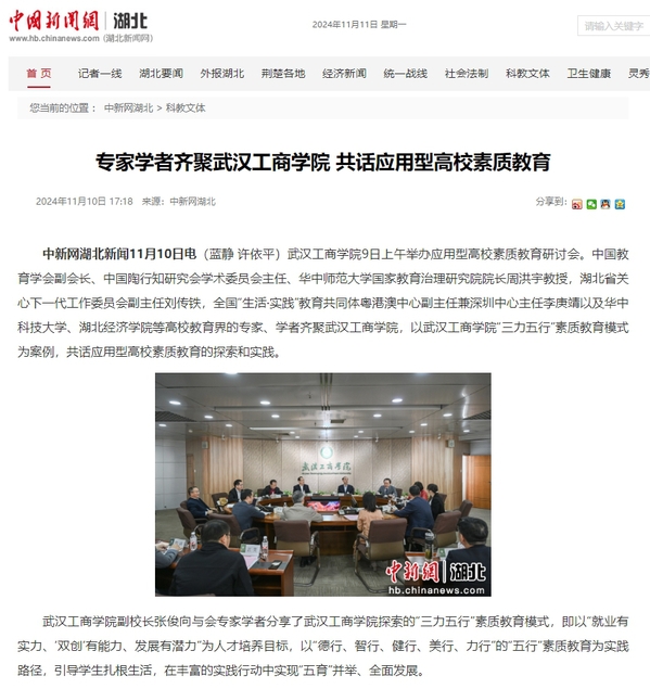 中新网湖北新闻11月10日电(蓝静 许依平)武汉工商学院9日上午举办应用型高校素质教育研讨会。中国教育学会副会长、中国陶行知研究会学术委员会主任、华中师范大学国家教育治理研究院院长周洪宇教授,湖北省关心下一代工作委员会副主任刘传铁,全国“生活·实践”教育共同体粤港澳中心副主任兼深圳中心主任李庚靖以及华中科技大学、湖北经济学院等高校教育界的专家、学者齐聚武汉工商学院,以武汉工商学院“三力五行”素质教育模式为案例,共话应用型高校素质教育的探索和实践。