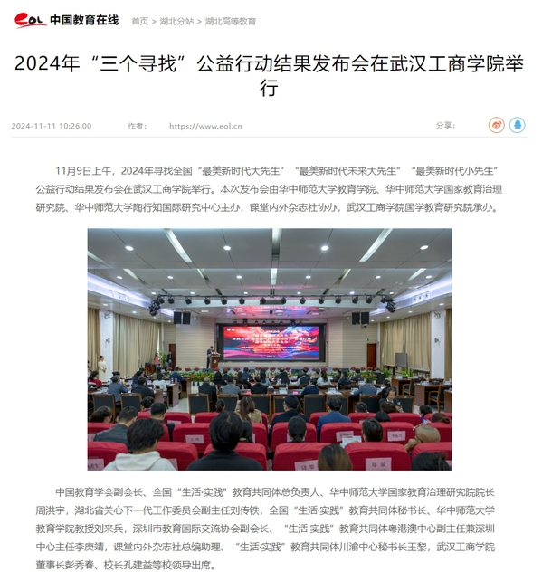 11月9日上午,2024年寻找全国“最美新时代大先生”“最美新时代未来大先生”“最美新时代小先生”公益行动结果发布会在武汉工商学院举行。本次发布会由华中师范大学教育学院、华中师范大学国家教育治理研究院、华中师范大学陶行知国际研究中心主办,课堂内外杂志社协办,武汉工商学院国学教育研究院承办。