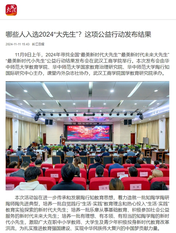 11月9日上午,2024年寻找全国“最美新时代大先生”“最美新时代未来大先生”“最美新时代小先生”公益行动结果发布会在武汉工商学院举行。本次发布会由华中师范大学教育学院、华中师范大学国家教育治理研究院、华中师范大学陶行知国际研究中心主办,课堂内外杂志社协办,武汉工商学院国学教育研究院承办。