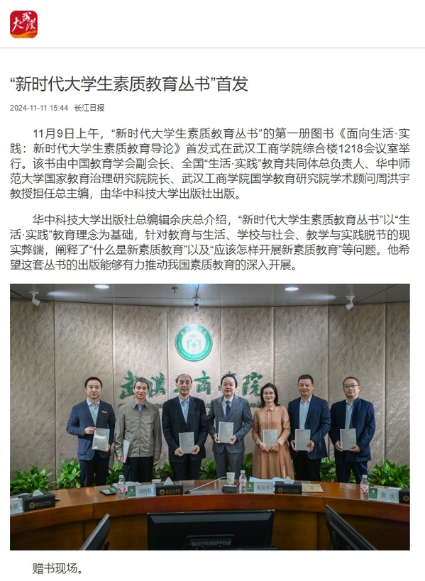 11月9日上午,“新时代大学生素质教育丛书”的第一册图书《面向生活·实践:新时代大学生素质教育导论》首发式在武汉工商学院综合楼1218会议室举行。该书由中国教育学会副会长、全国“生活·实践”教育共同体总负责人、华中师范大学国家教育治理研究院院长、武汉工商学院国学教育研究院学术顾问周洪宇教授担任总主编,由华中科技大学出版社出版。