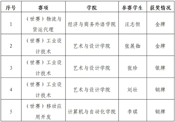 武汉工商学院校领导和各相关学院领导高度重视此次比赛,组建了经验丰富、实力强劲的教练团队,在全校精心选拔了12名优秀学子参加了物流与货运代理、工业设计技术、移动应用开发三类赛项的比赛,经过激烈角逐,最终斩获2金、1银、2铜的好成绩。其中,来自经济与商务外语学院的学生汪志恒斩获物流与货运代理赛项金牌、来自艺术与设计学院的学生张展铷斩获工业设计技术赛项金牌;来自艺术与设计学院的学生张珍、刘壮分获工业设计技术赛项的银牌、铜牌;来自计算机与自动化学院的学生李琪获得移动应用开发赛项的铜牌。