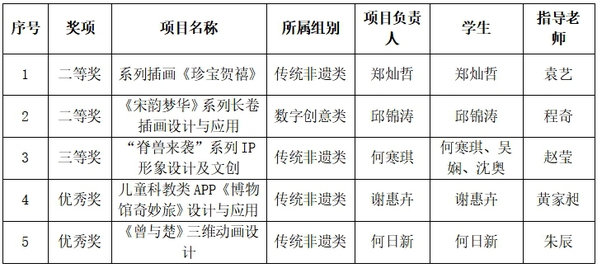 其中,学校系列插画作品《珍宝贺禧》斩获传统非遗类二等奖;《宋韵梦华》系列长卷插画设计与应用作品斩获数字创意类二等奖;“脊兽来袭”系列IP形象设计及文创作品斩获传统非遗类三等奖;儿童科教类APP《博物馆奇妙以及旅》设计与应用作品以及《曾与楚》三维动画设计作品均荣获传统非遗类优秀奖。