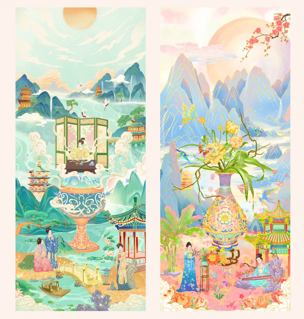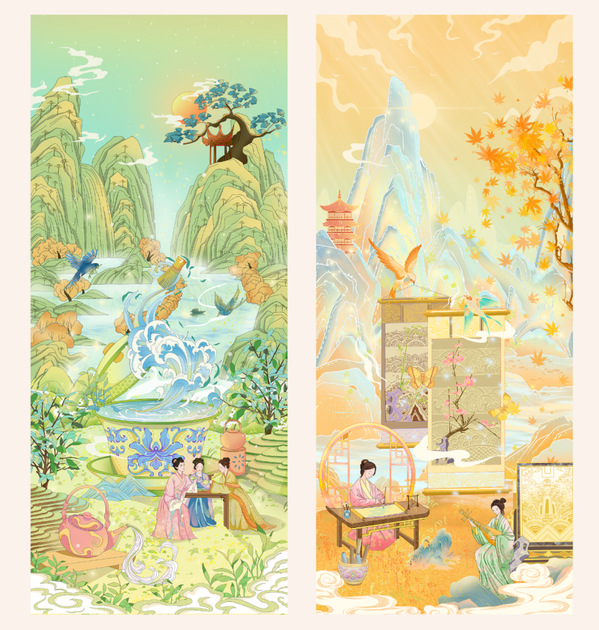 图为《宋韵梦华》系列长卷插画设计与应用作品展示