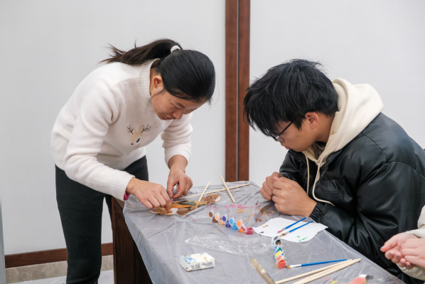图为非遗传承人正在教授学生制作糖画和编织中国结 见习摄影:熊昱淞